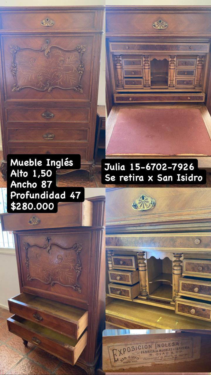 <b>Antiguo Mueble Inglés - Excelente Estado</b><div><br></div><div><b>Descripción:</b></div><div>Elegante mueble de estilo inglés en madera de alta calidad con delicada marquetería floral y herrajes de bronce originales. Una pieza clásica que combina espacio de guardado con un escritorio funcional oculto.</div><div><br></div><div><b>Detalles del interior</b>: Cuenta con "nido de abeja" (múltiples cajoncitos internos) y secreter forrado en cuero/tapiz rojizo.</div><div><b><br></b></div><div><b>Medidas:</b> 1,50 m (Alto) x 87 cm (Ancho) x 47 cm (Profundidad).</div><div><b><br></b></div><div><b>Estado:</b> Muy bien conservado, con marcas de uso auténticas que resaltan su antigüedad.</div><div><br></div><div>Ubicación: Se retira por San Isidro.</div><div><b><br></b></div><div><b>Precio: $280.000</b></div>