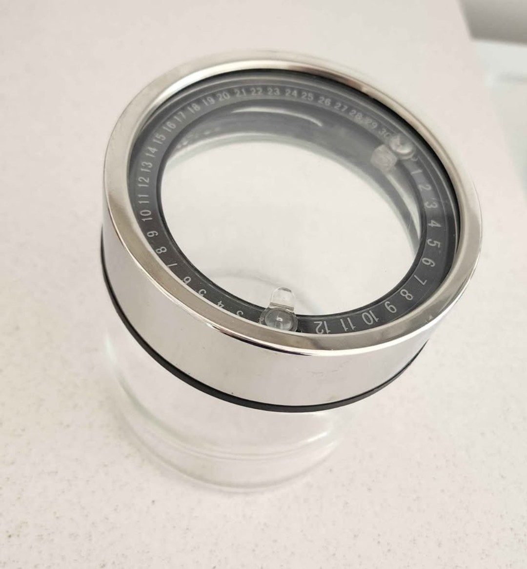 Contenedor de vidrio con tapa metálica, diseñado con un calendario funcional integrado en el borde. 13cm de alto, 11cm de diámetro