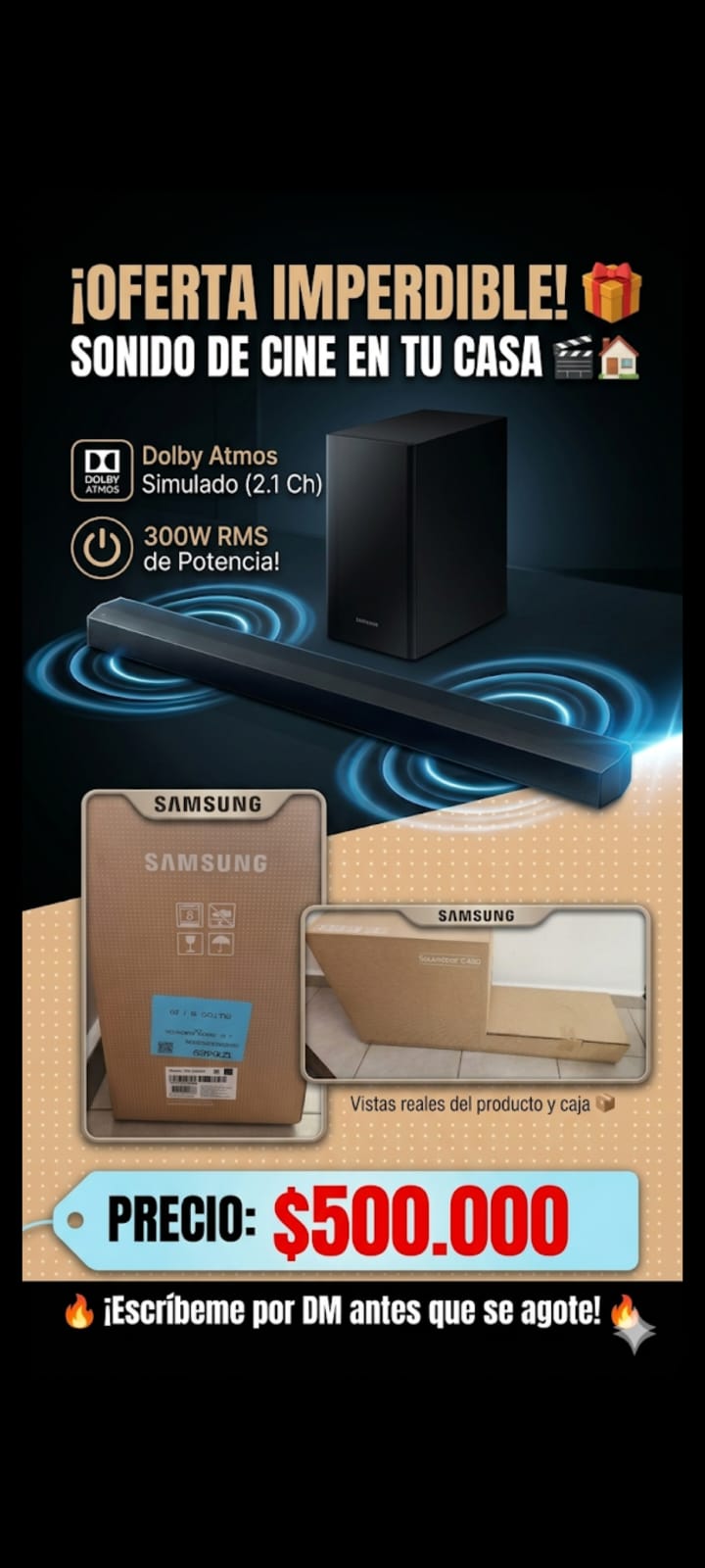 Barra de sonido SAMSUNG nueva ( caja cerrada) <div><br></div><div>Sistema: Cuenta con 2.1 canales e incluye un subwoofer inalámbrico para graves potentes. </div><div>Conectividad: Ofrece conexión Bluetooth para vincular dispositivos y entrada de audio óptico. </div><div>Audio: Soporta varios formatos como AAC, MP3, WAV y FLAC, además de incluir un modo juego. </div><div>Potencia: Tiene una potencia total de 300W.</div>